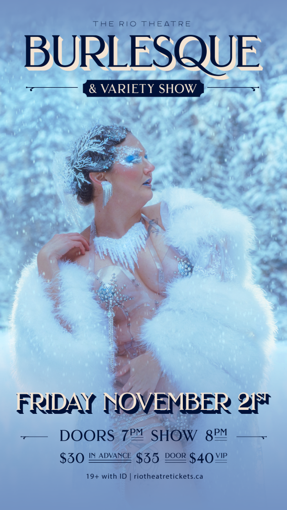 A copious cavalcade of top notch talent and captivating cabaret await at The Rio Theatre Burlesque & Variety Show on Friday, November 21! Local luminary April O’Peel has curated a show full of wonder sure to dazzle and delight our fun loving audience! The theme is NO THEME! That’s right! These talented performers