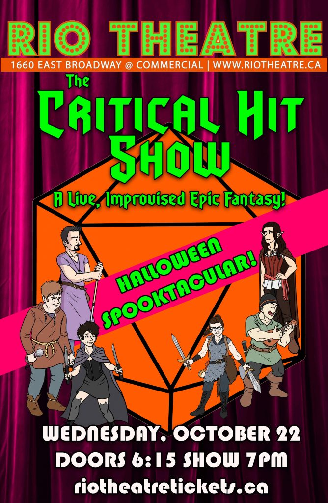 The live, smash hit epic comedy THE CRITICAL HIT SHOW returns to the Rio Theatre’s stage on Wednesday, October 22 for more monstrous mirth, merriment, and snacks! Prepare yourself for a night of laughter, as some of Vancouver’s best comedic performers grace the stage in a night featuring intrepid players on