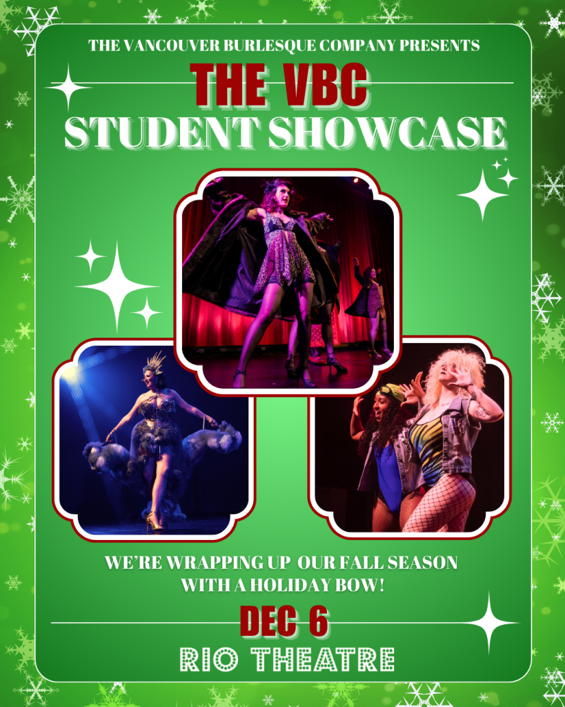 The Vancouver Burlesque Co. is proud to present their December Student Showcase at the Rio Theatre on Saturday, December 6. Join the VBC as we wrap up 2025 in a sparkly bow and celebrate our outstanding students, teachers, and alumni! With large group acts to ring your bells and sparkling solos