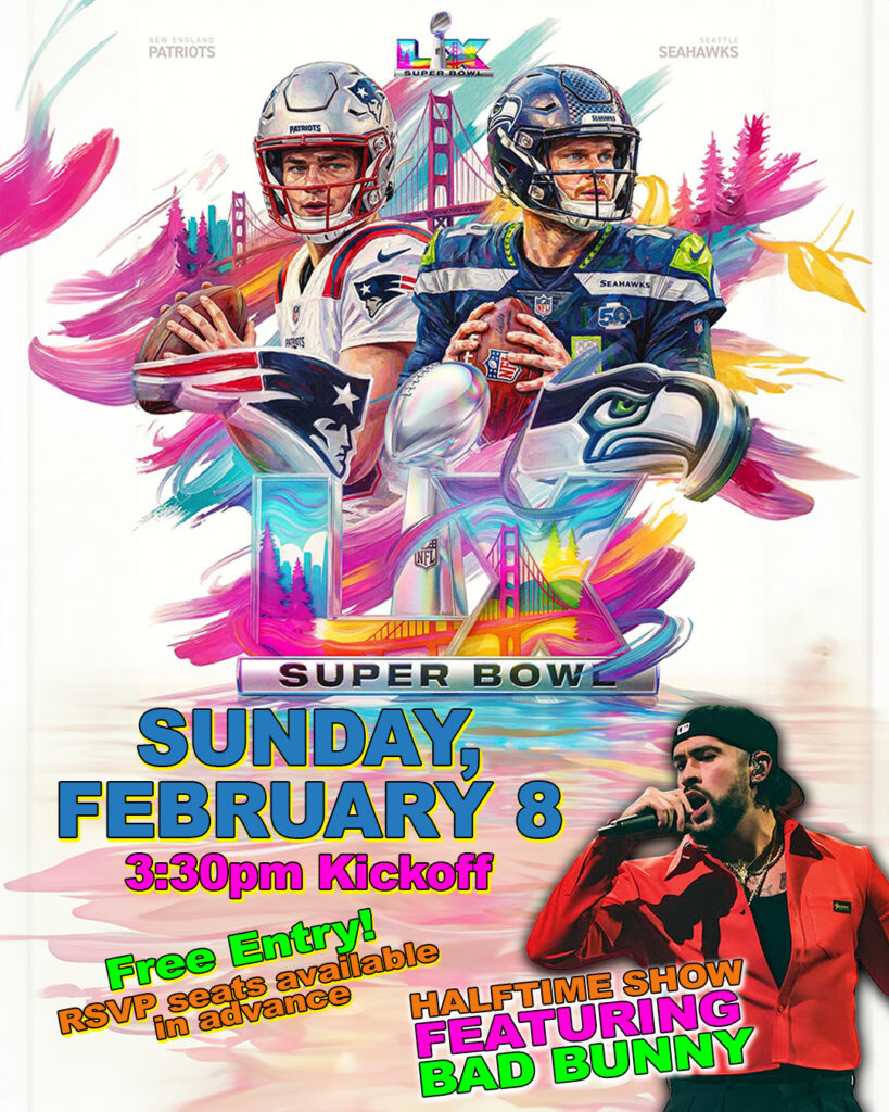 Enjoy the ultimate game day experience on Sunday, February 8 for Super Bowl LX, as the Seattle Seahawks take on the New England Patriots at our annual (not to mention FREE!) screening and watch party at the Rio Theatre. Featuring half time show performance from Puerto Rican reggaeton and Latin trap artist Bad Bunny, the first Latino and Spanish-speaking singer to perform as a solo act.