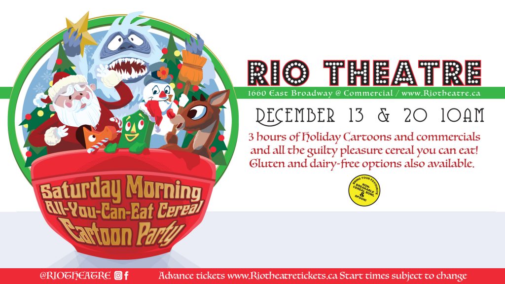 The Saturday Morning All-You-Can-Eat Cereal Cartoon Party is returning to the Rio Theatre with a brand new collection of specially curated retro TV goodness covered in sugary cereal, and sprinkled with endless Holiday cheer. It’s Volume XI – The Christmas Show! Even better? This program will be screening on Saturday, December 13 and again on Saturday, December 20, so you have TWO chances to make merry and eat cereal in a movie theatre.